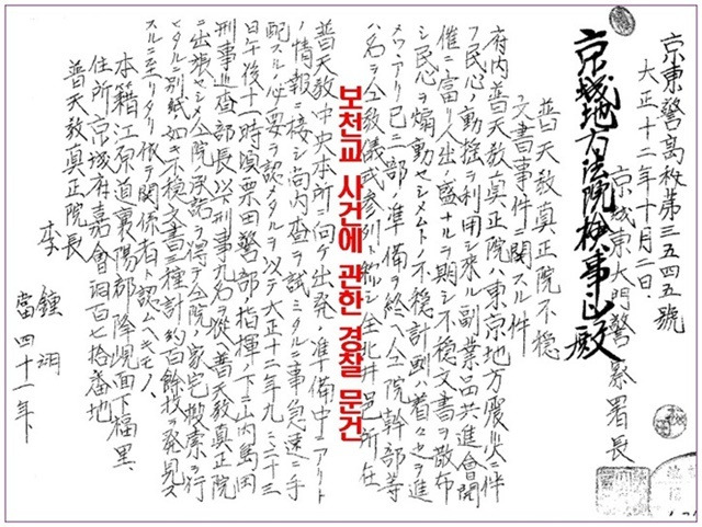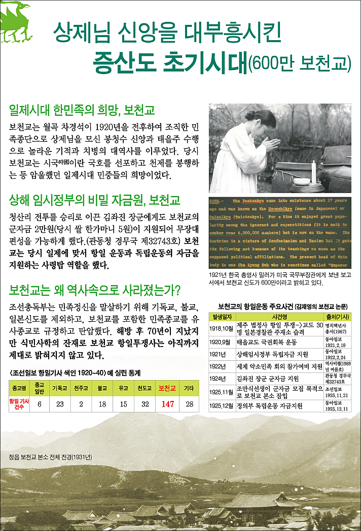 "1919년 3.1운동이 일어난 후 일제는 '정치에 관한 범죄처벌의 건'을 만들어 보천교를 비롯한 민족종교를 탄압하고 파괴시켜 나갔다. 1920년 청송군 일본경찰서는 안동을 비롯한 경상북도 북부지역의 보천교 신도 3천여 명을 체포하여 감금하였고, 그 중 수십 명이 고문치사, 700여 명을 기소하였고,