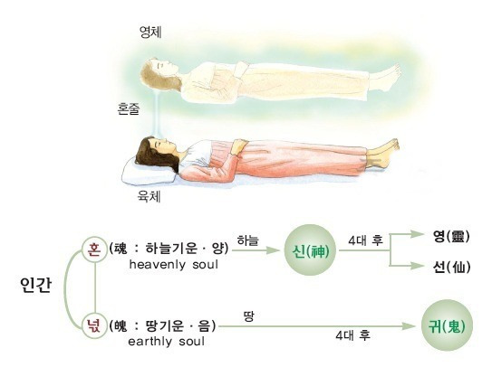넋은 땅으로 돌아가 4대가 지나면 귀(鬼)가 되느니라.” 상제님께서 말씀하시기를 “자손을 둔 신은 황천신(黃泉神)이니 삼신(三神)이 되어 하늘로부터 자손을 타 내리고 자손을 두지 못한 신은 중천신(中天神)이니 곧 서신(西神)이 되느니라.”